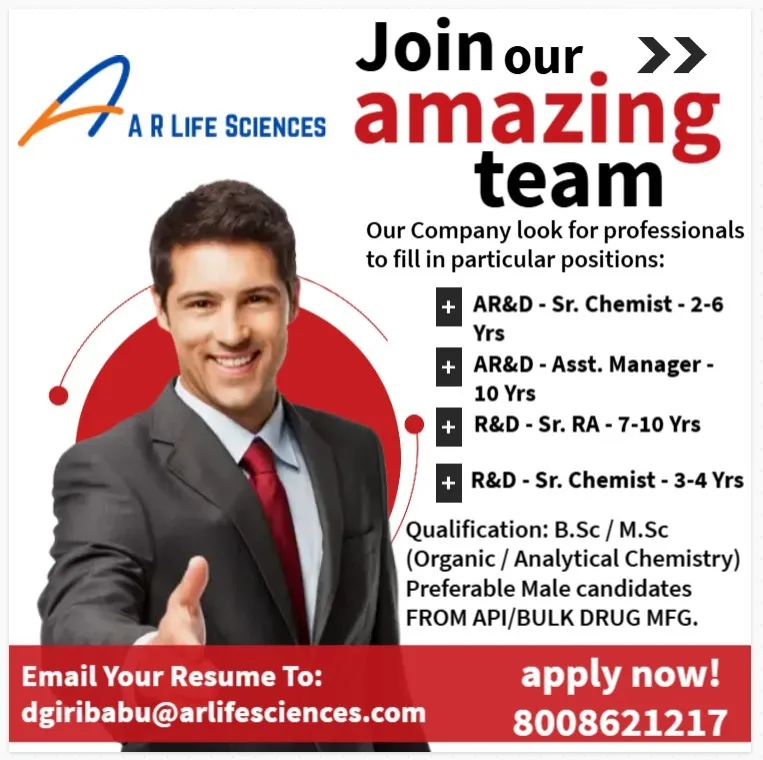 IndiaPharmaJobs.in is an independent job information platform that publishes verified pharmaceutical and healthcare job updates. We are not affiliated with AR Life Sciences or any recruitment agency. Applicants should apply directly through the official contact details provided and verify information independently. Life Sciences Hiring ARD RD Senior Chemist Assistant Manager Senior RA Roles