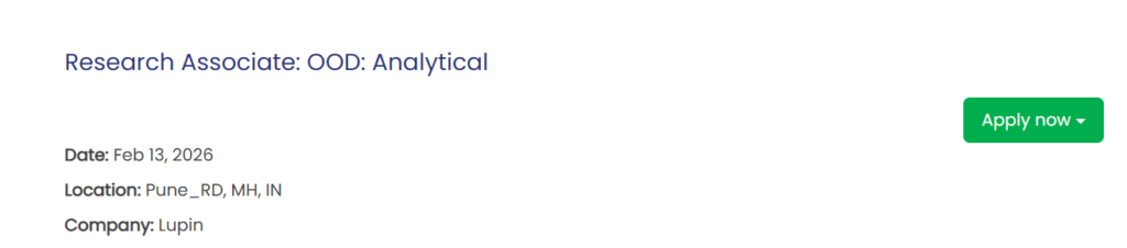Lupin’s Research Associate – Analytical opening in Pune is an excellent opportunity for professionals with strong laboratory experience in pharmaceutical analysis. With a focus on analytical development, stability studies, and OOD investigations, this role offers both technical depth and long-term growth. If you meet the eligibility criteria, apply soon and take the next step in your pharma R&D career. Lupin Hiring Research Associate Analytical Jobs in Pune