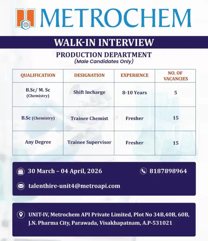 Metrochem API Hiring Freshers for Production Job and experienced candidates in Visakhapatnam apply before April 4 interview dates.