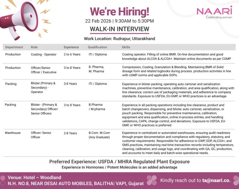 This recruitment drive offers a valuable opportunity for pharmaceutical professionals looking to grow within regulated manufacturing environments. Naari Pharma provides exposure to global compliance standards, structured manufacturing systems, and career growth within formulation operations.