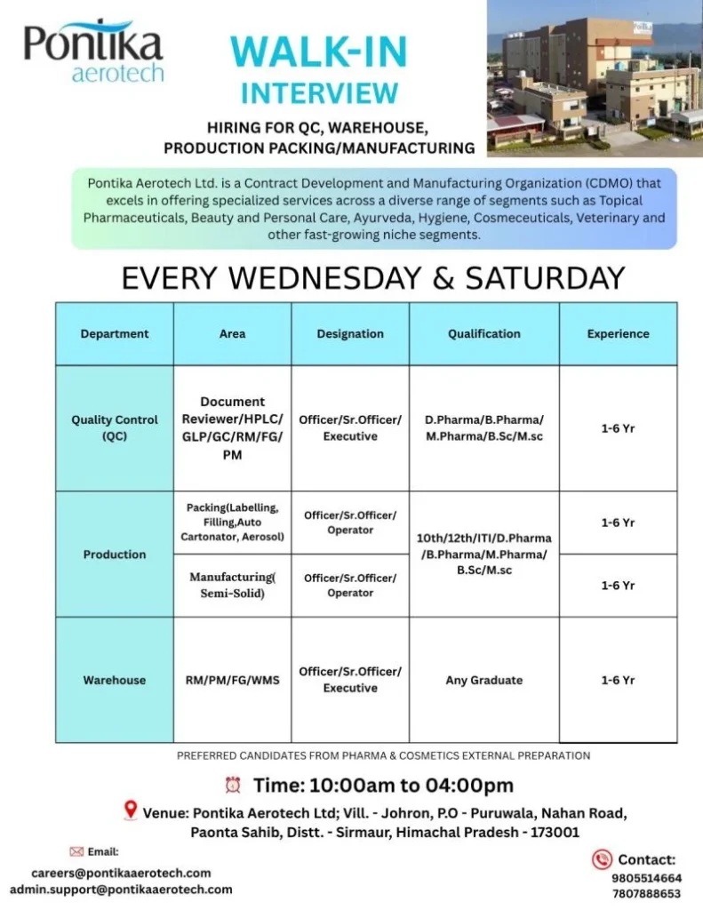 Professionals seeking opportunities in pharmaceutical and cosmetic manufacturing can explore a promising opening with Pontika Aerotech Ltd. The company is conducting an ongoing walk-in hiring drive for multiple roles across QA, QC, Production, and Warehouse departments.