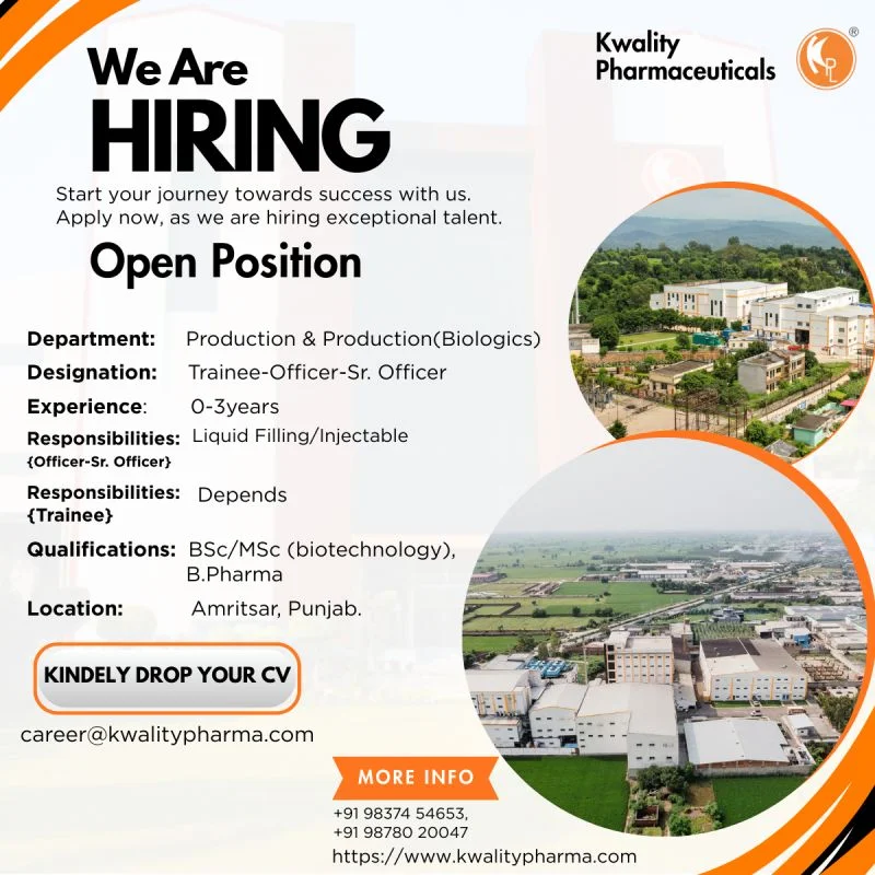 Production Jobs Trainee to Senior Officer at Kwality Pharmaceuticals in Biologics at Punjab facility. Freshers and experienced apply via email.