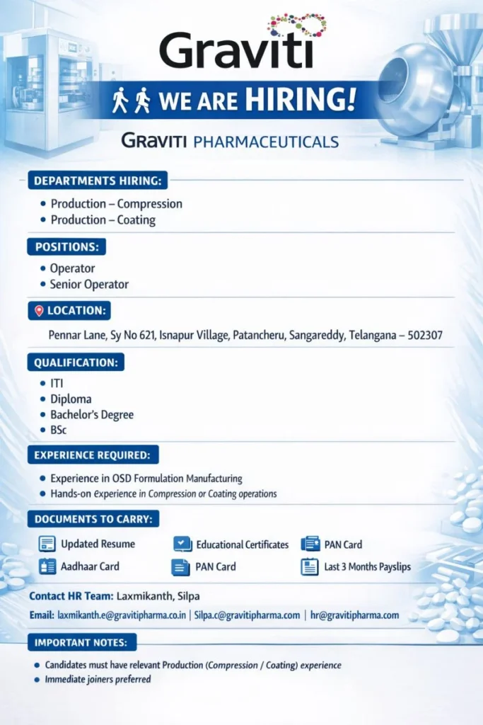 Graviti Pharmaceuticals is a rapidly growing pharmaceutical manufacturer specializing in complex generics and advanced Oral Solid Dosage (OSD) formulations. The company focuses on high-quality manufacturing standards, regulatory compliance, and innovation-driven production processes. With a strong presence in Telangana’s pharma manufacturing hub, Graviti Pharmaceuticals continues to expand its operations and strengthen its production workforce. Production Operator Senior Operator Jobs