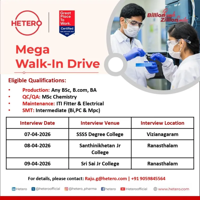 The Production, QA, QC, Maintenance & SMT jobs at Hetero offer an excellent opportunity for freshers and entry-level candidates to begin their careers in the pharmaceutical industry. Hetero is conducting a mega walk-in drive across Andhra Pradesh, providing roles in multiple departments. This hiring drive is ideal for candidates looking to gain hands-on experience in a GMP-regulated pharma environment.