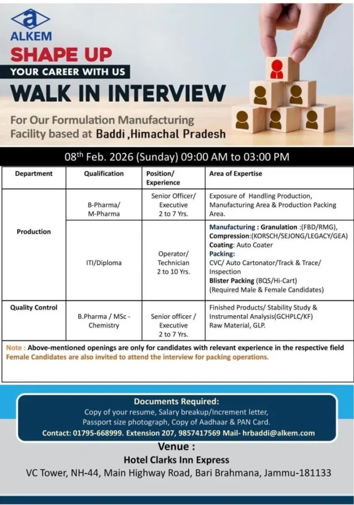 Production QC Jobs at Alkem Laboratories in Baddi with walk-in interview for experienced pharma manufacturing professionals.
