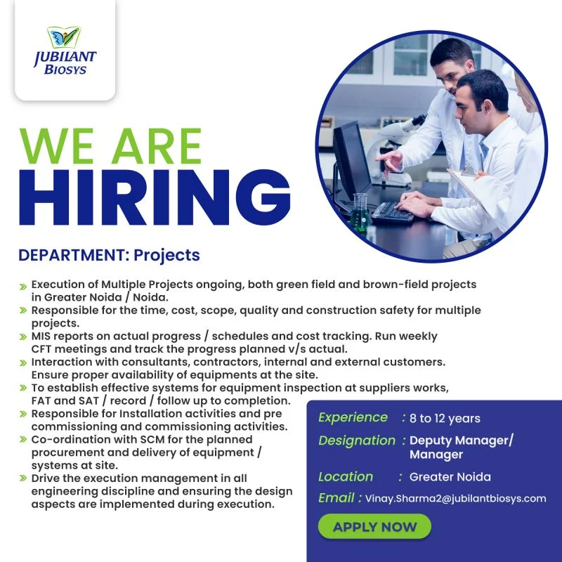 Projects Manager Job at Jubilant Biosys in Greater Noida for engineering candidates with 8 to 12 years experience apply now