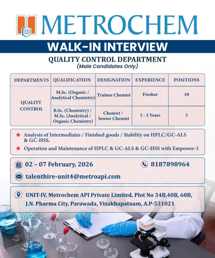 To strengthen its Quality Control operations, Metrochem API is conducting a large-scale walk-in recruitment drive for chemistry graduates and postgraduates who are eager to build or advance their careers in pharmaceutical quality control. Quality Control Jobs Trainee Chemist