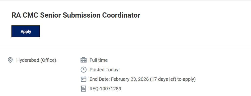 A senior regulatory affairs opportunity is open for highly experienced professionals specializing in Chemistry, Manufacturing, and Controls (CMC) submissions. The RA CMC Senior Submission Coordinator role is designed for candidates who can independently manage complex global submissions, ensure regulatory compliance, and lead cross-functional coordination activities. This position offers long-term career growth for professionals seeking ownership of end-to-end CMC regulatory operations within a global pharmaceutical environment. RA CMC Senior Submission Coordinator Job
