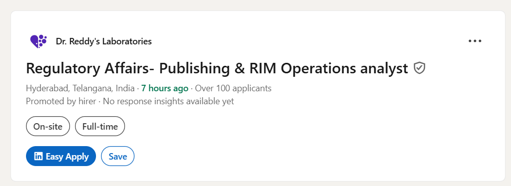 The regulatory landscape in global pharmaceuticals is evolving rapidly, with increasing emphasis on digital submissions, structured data, and compliance-driven workflows. Dr. Reddyβs Laboratories is currently seeking qualified professionals for the position of Regulatory Affairs β Publishing & RIM Operations Analyst at its Hyderabad location.