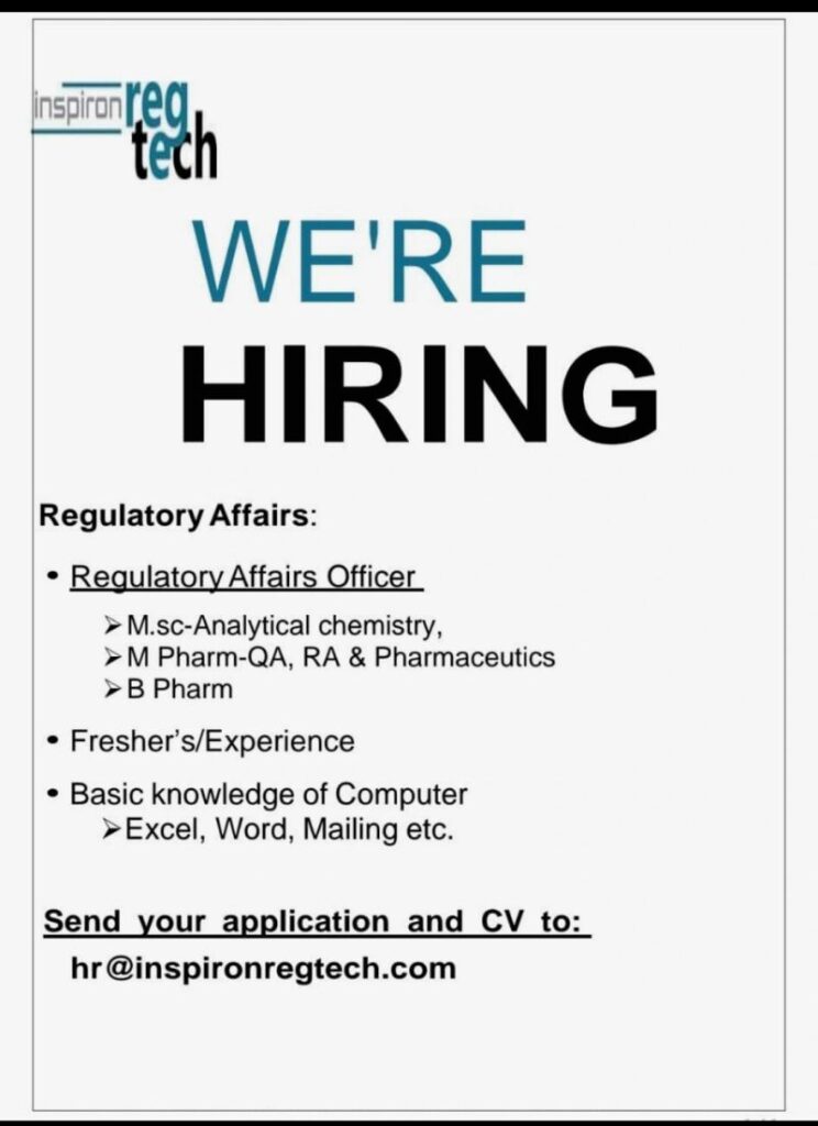 If you are planning to build a career in pharmaceutical regulatory affairs, a new opportunity has opened at Inspiron RegTech. The company is inviting applications for the role of Regulatory Affairs Officer, suitable for pharmacy and analytical chemistry graduates. This role is ideal for freshers as well as candidates with limited experience who want exposure to regulatory documentation and compliance processes.