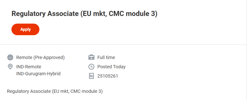 • Search for “Regulatory Associate (EU mkt, CMC module 3)”