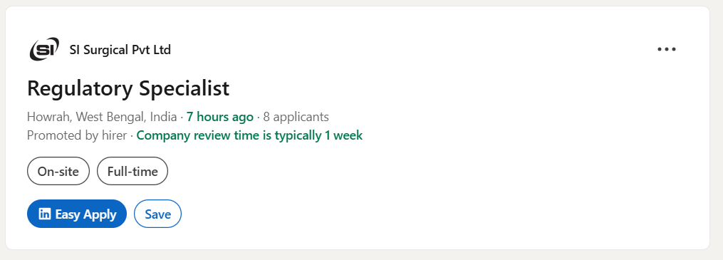 Regulatory Specialist Job SI Surgical Pvt Ltd Howrah. Apply online for regulatory affairs role with ISO, CE, BIS certification experience.