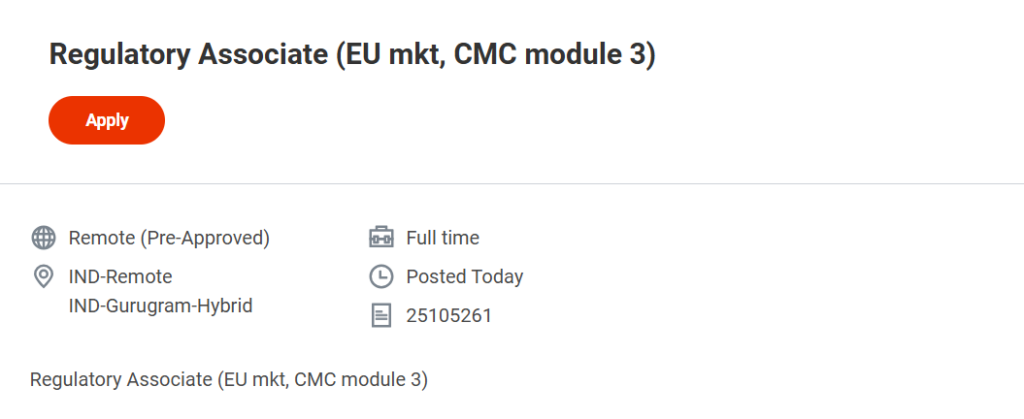 - Job Title: Regulatory Associate โ EU Market (CMC Module 3)