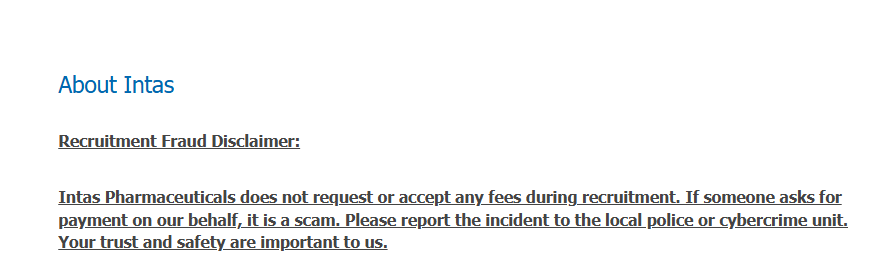 Intas Pharmaceuticals does not charge any fees at any stage of the recruitment process. If anyone requests payment on behalf of the company, it should be considered fraudulent. Candidates are advised to report such incidents to local authorities or cybercrime units. Always apply through official channels to ensure safety. Research Associate ADL Job at Intas Pharma