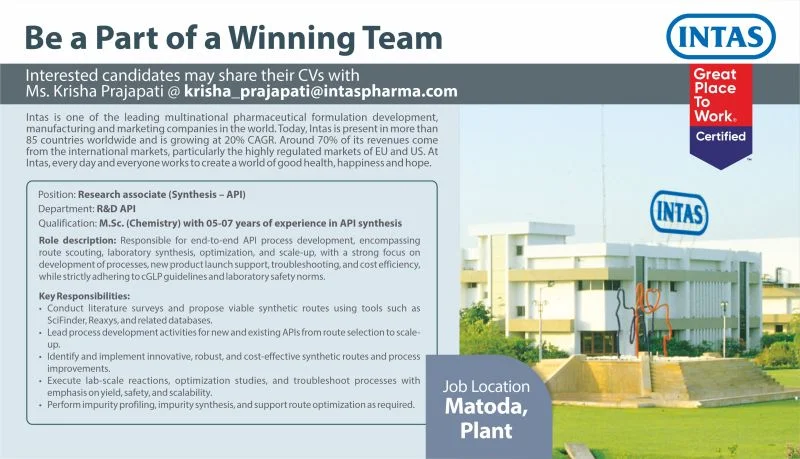 If you are an experienced API R&D professional passionate about synthesis and process development, this is your opportunity to grow with a global pharmaceutical leader. Apply now and advance your R&D career with Intas Pharmaceuticals. Research Associate API Synthesis Jobs