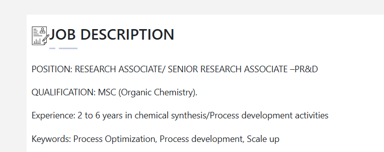 Professionals with a strong background in organic chemistry and process development have an excellent opportunity to work in pharmaceutical research. A reputed pharma organization is hiring for Research Associate / Senior Research Associate roles in Process Research & Development (PR&D). This position is ideal for candidates experienced in chemical synthesis, process optimization, and scale-up activities.