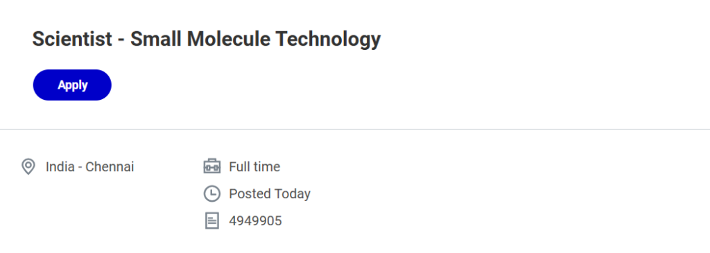 IndiaPharmaJobs.in is an independent job information platform and is not affiliated with Pfizer or any other organization. We do not charge any fees for job postings or applications. Candidates are advised to verify job details from the official company website before applying. Scientist Small Molecule Technology Job at Pfizer