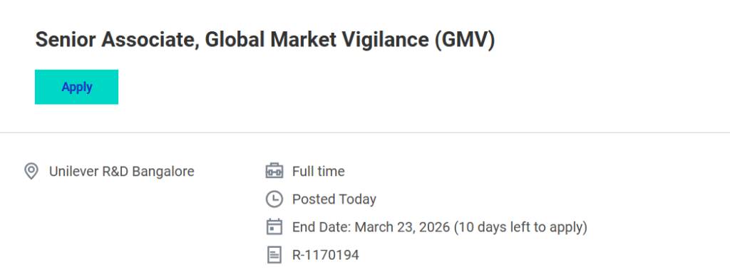 Unilever has announced an exciting opportunity for experienced pharmacovigilance professionals to join its Global Market Vigilance (GMV) team in Bangalore. The company is hiring a Senior Associate – Global Market Vigilance who will contribute to safety data analysis, adverse event monitoring, signal detection, and regulatory compliance for the organization’s wellbeing product portfolio.