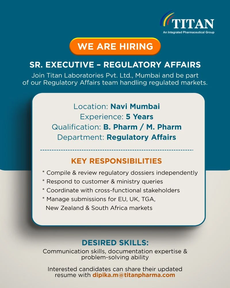 Senior Executive Regulatory Affairs Job at Titan Laboratories Navi Mumbai. Apply for global regulatory submissions and pharma compliance career opportunity now.