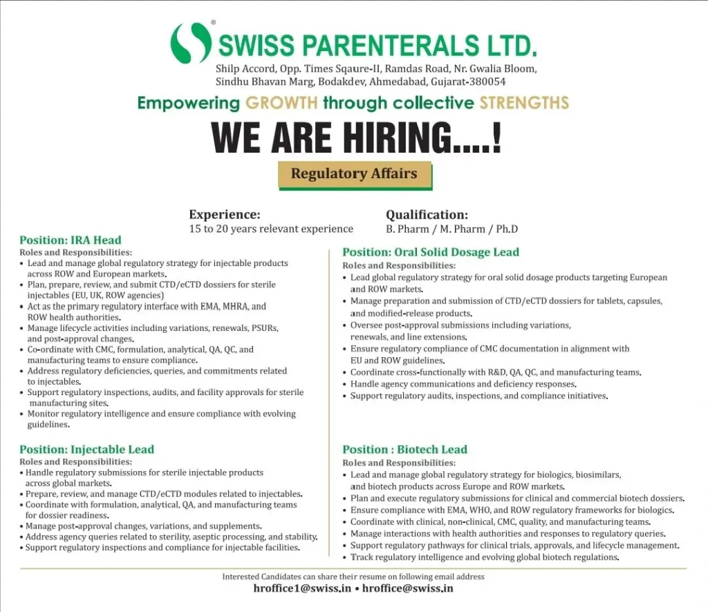 Swiss Parenterals Ltd. is strengthening its global Regulatory Affairs leadership team and invites highly experienced professionals to apply for senior-level regulatory positions at its corporate office in Ahmedabad, Gujarat. These leadership roles are intended for seasoned regulatory experts who can design, execute, and govern regulatory strategies across injectables, oral solid dosage forms, and biotechnology portfolios in regulated and semi-regulated markets.