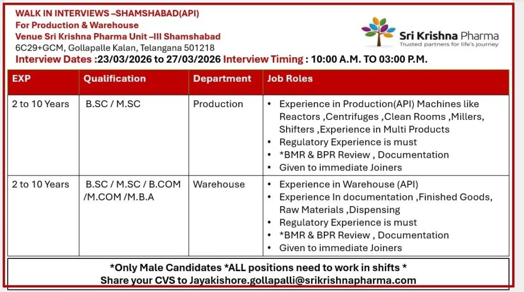 Sri Krishna Pharma Hiring for Production QC Warehouse Packing Jobs in Hyderabad. Freshers and experienced candidates apply for pharma roles.