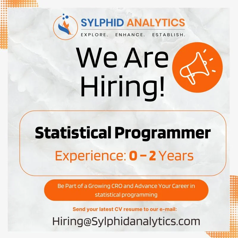 Statistical Programmer Job for Freshers in Hyderabad at Sylphid Analytics. Apply via email. Life Sciences, SAS, R, Python candidates eligible.