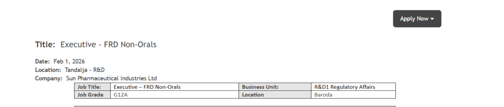 Sun Pharmaceutical Industries Limited is one of Indiaโs most respected and globally recognized pharmaceutical organizations, known for its strong focus on research-driven innovation and high-quality healthcare solutions. With a presence across regulated and emerging markets, the company consistently invests in advanced research platforms, complex formulations, and talent development. Sun Pharmaโs R&D ecosystem provides professionals with exposure to cutting-edge drug development projects, global regulatory standards, and cross-functional collaboration, making it an ideal workplace for scientists aiming to grow in formulation research and development. Sun Pharma Hiring for Executive FRD Non Oral