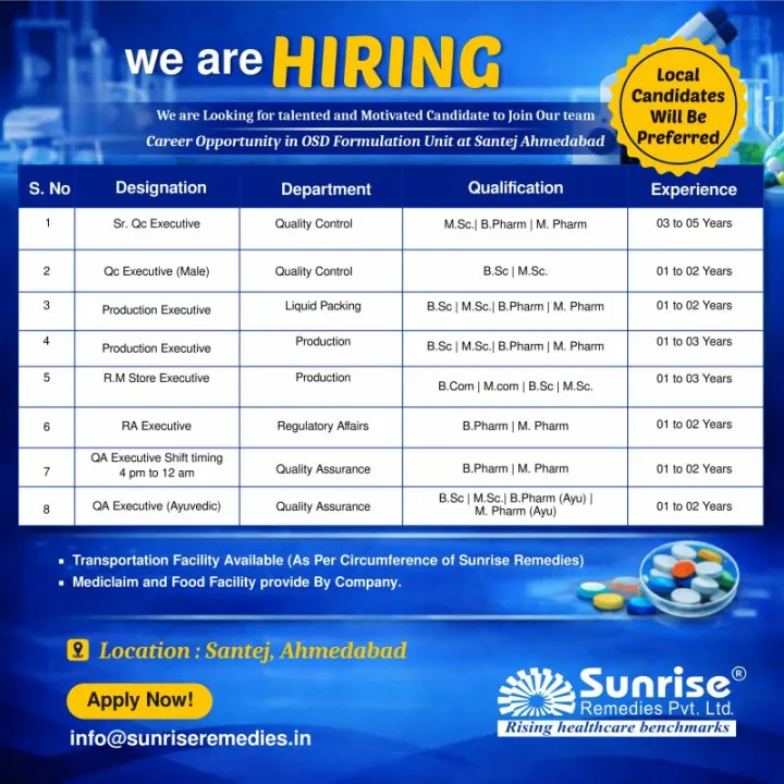 Sunrise Remedies Hiring for QC QA Production & RA Roles in Ahmedabad for experienced pharma candidates apply via email for multiple openings.