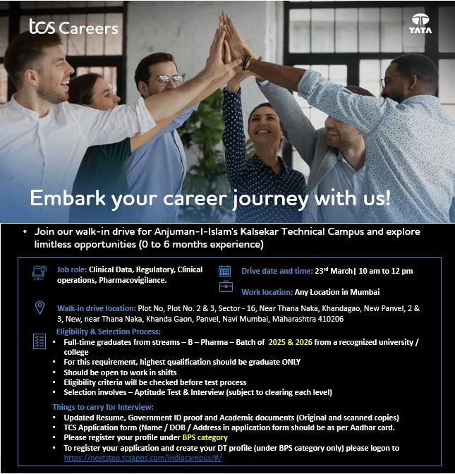 Candidates from the 2025 and 2026 B.Pharm batches with up to six months of experience are invited to attend the walk-in interview scheduled in Navi Mumbai. TCS Walk In Interview for B.Pharm Freshers