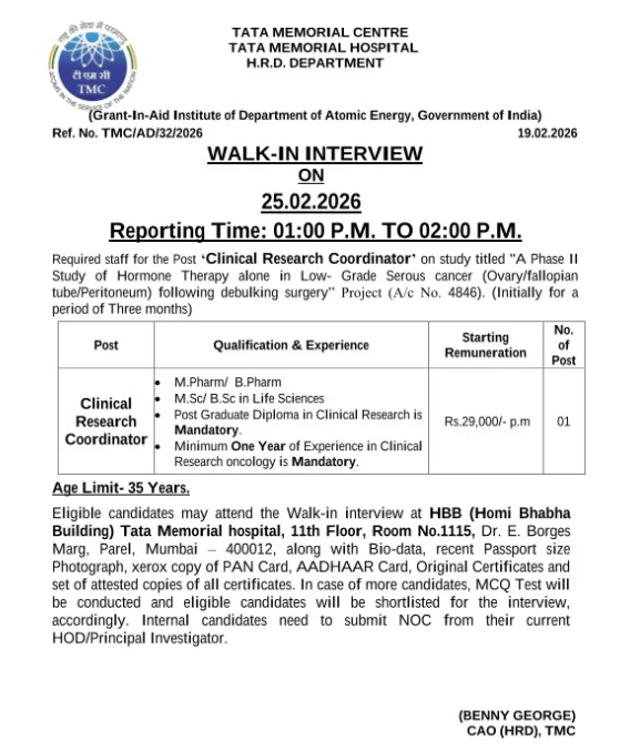 TMC Hiring Clinical Research Coordinator Job in Mumbai for oncology trial with ₹29,000 salary walk-in interview on February 25.