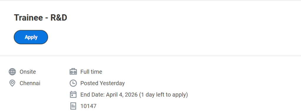 The position is based in Chennai and is a full-time, on-site role within the R&D department.