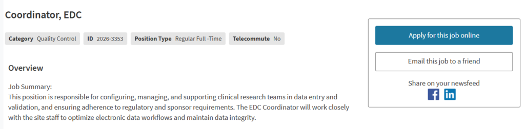 Position: EDC Coordinator (Electronic Data Capture Coordinator)