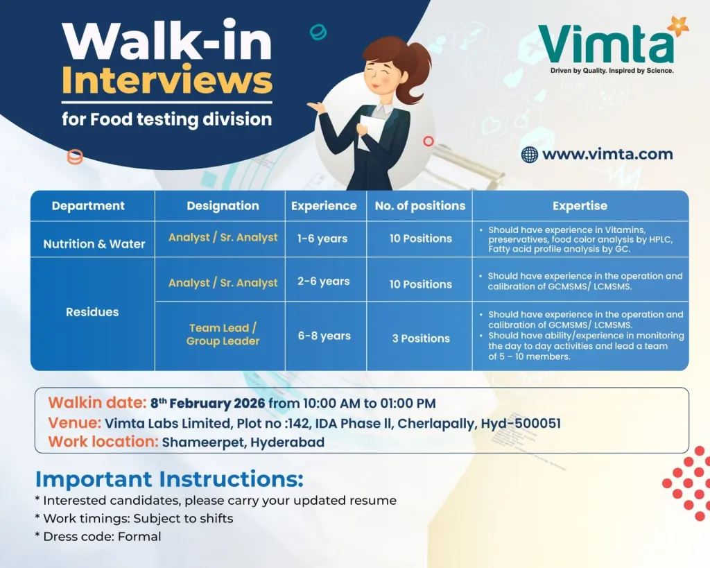 To support increasing demand in food safety and residue analysis, the organization is expanding its Food Testing Division at its Hyderabad operations through a walk-in recruitment drive. Vimta Labs Hiring Food Testing Division