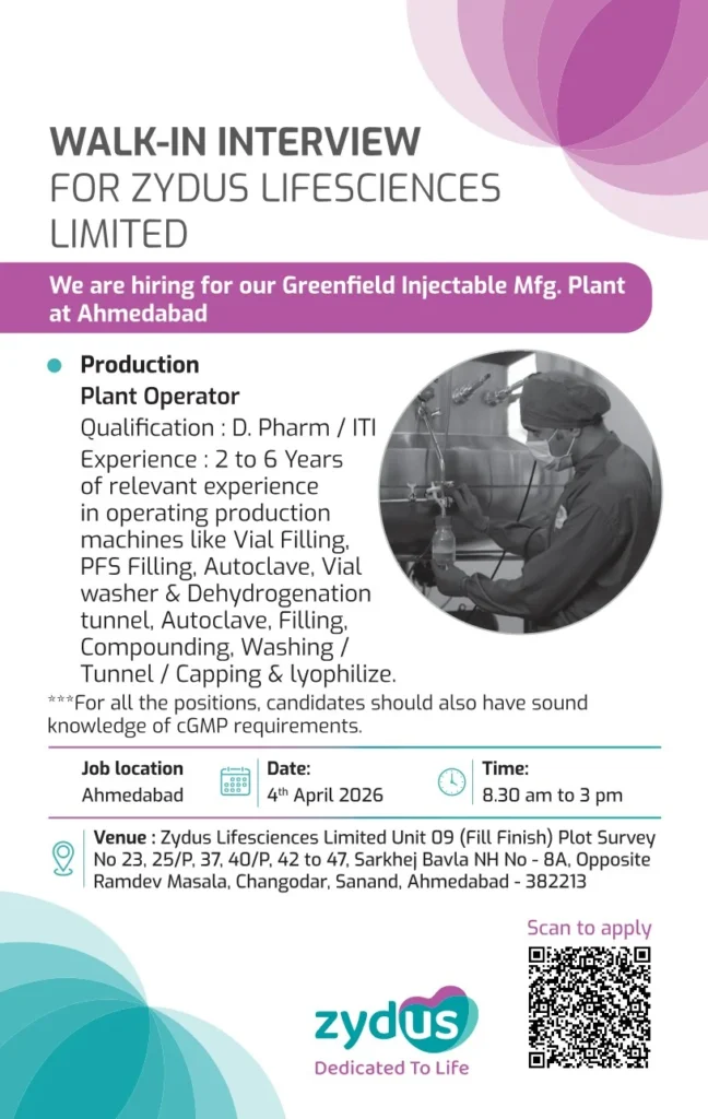 Pharmaceutical manufacturing professionals looking for growth in injectable production have a valuable opportunity here. Zydus Lifesciences Limited is conducting a walk-in drive for Production (Plant Operator) roles at its advanced injectable facility in Ahmedabad. Candidates with relevant experience in production operations and cGMP compliance can explore this opportunity to work with one of India’s leading pharma organizations.